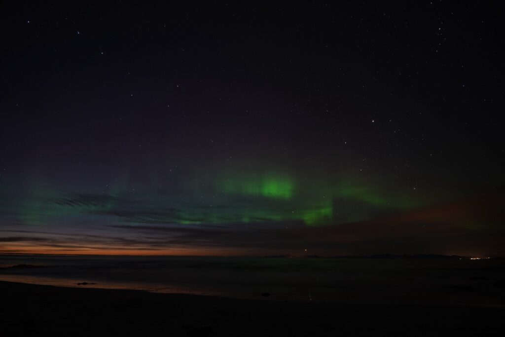 • オーロラは肉眼だと白っぽい(カメラで撮ると緑に写る)